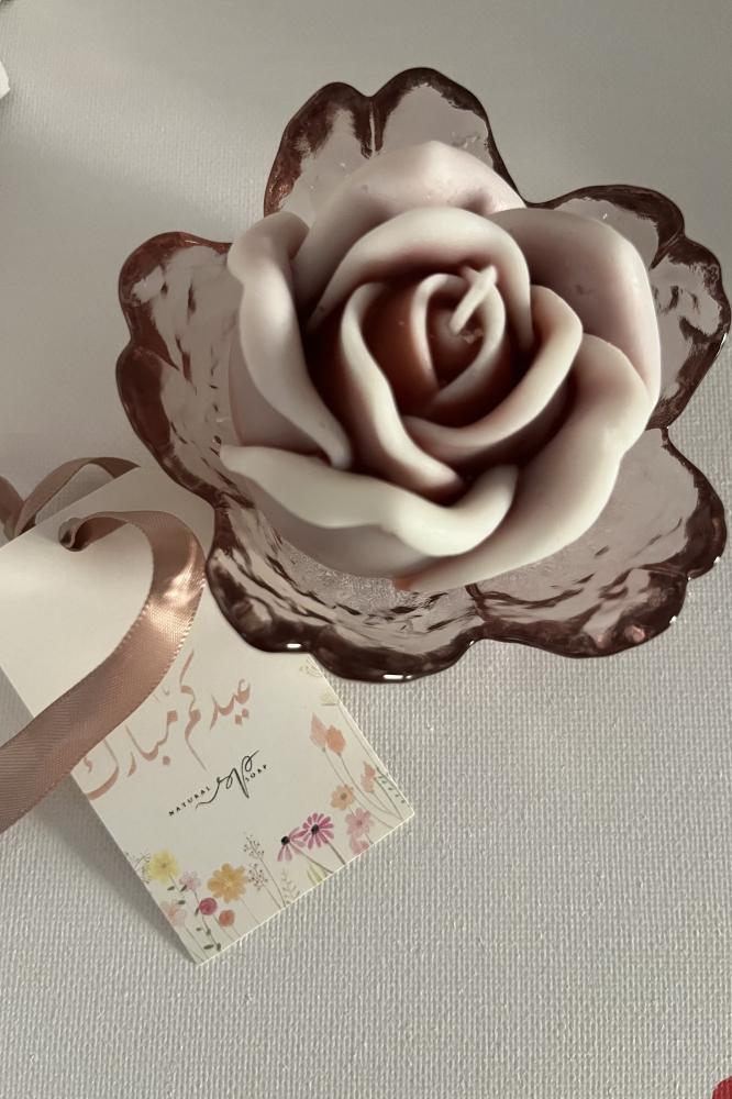 شمعة بشكل ورائحة الورد مع شمعدان زجاجي وردي اللون مصنوعة مت شمع الصويا والنحل وعطر آمنه لأوقاتكم الخاصة