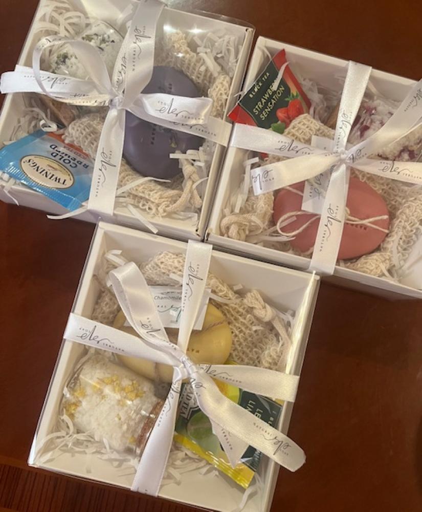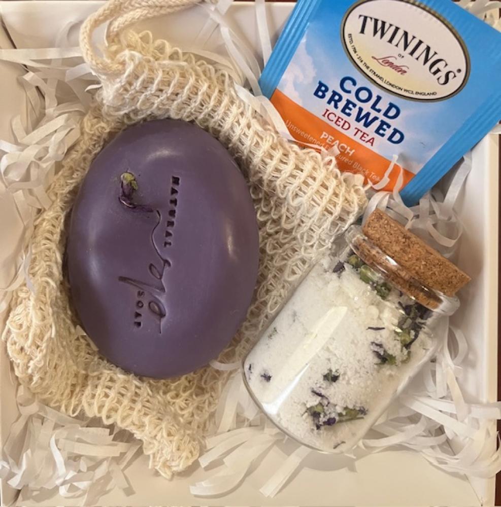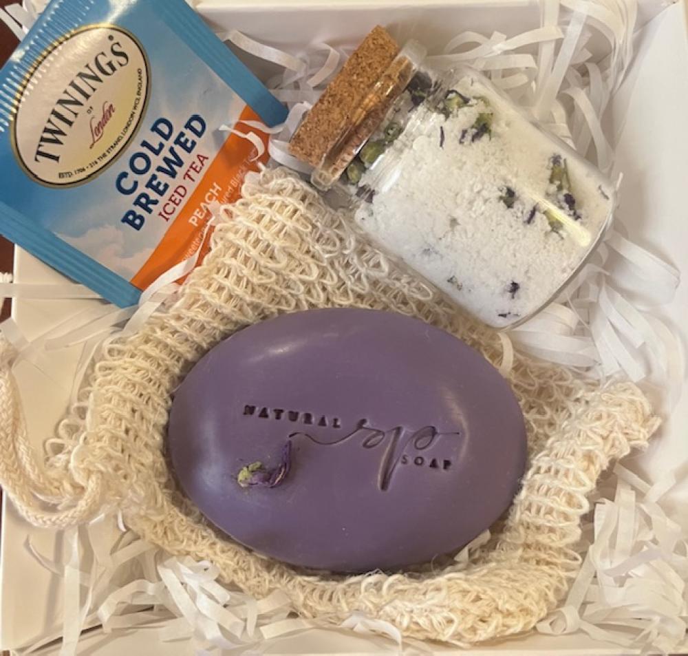 هدية جميلة مكونه من صابونه البنفسج الناعمة وليفة استحمام واملاح حمام مع بتلات زهرة البنفسج وزيوت مرطبة