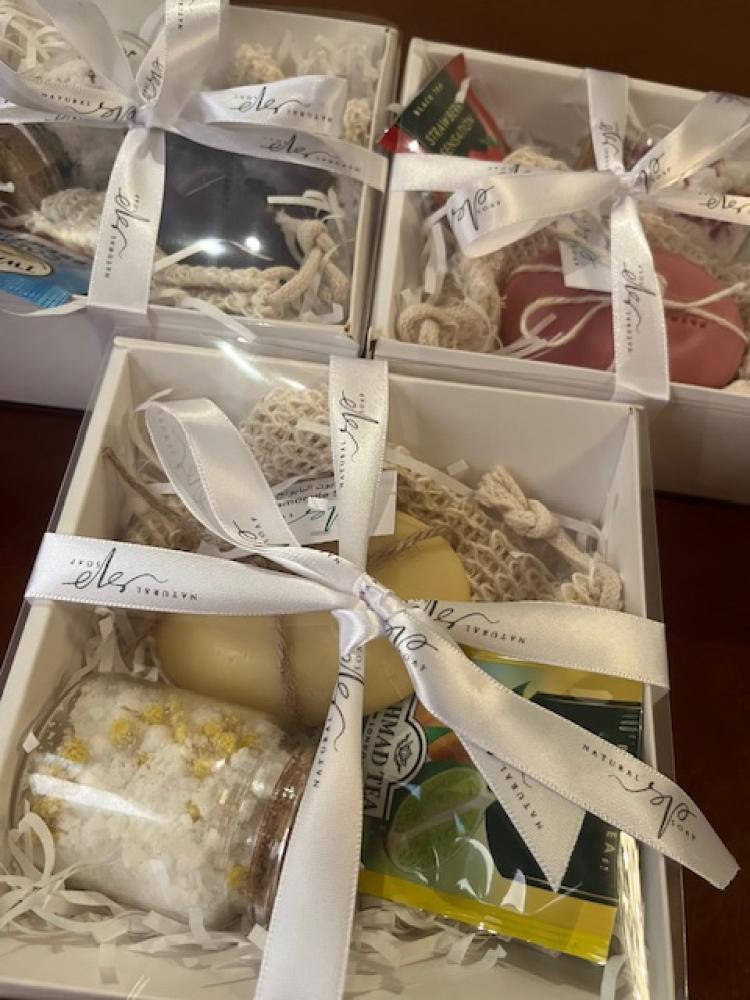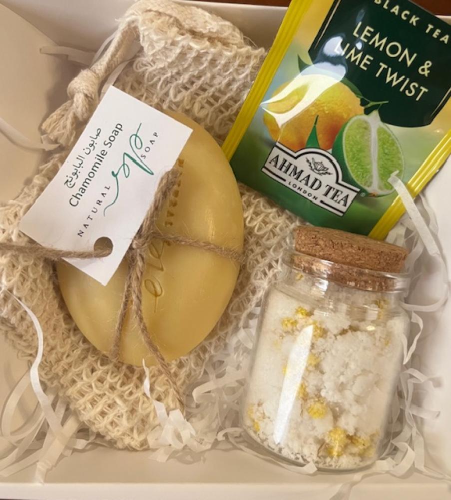 هدية لطيفة مكونة من املاح الحمام ذات رائحة جميلة مزيج من العنبر الهادئ والبيبي باودر وزيوت مرطبة مع صابونة البابونج وليفة استحمام