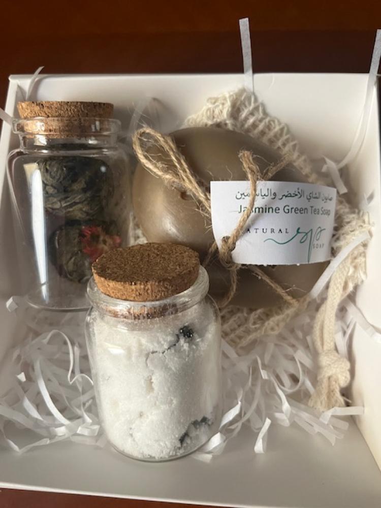 لعشاق الشاي الأخضر الصيني ورائحة حقول الياسمين صابونة بالشاي الاخضر وليفة استحمام وملح حمام او نقع ارجل مع اوراق الشاي ذات الفوائد العميقة وكرتين من الشاي الرائع