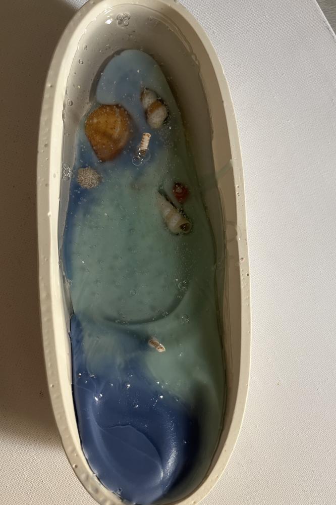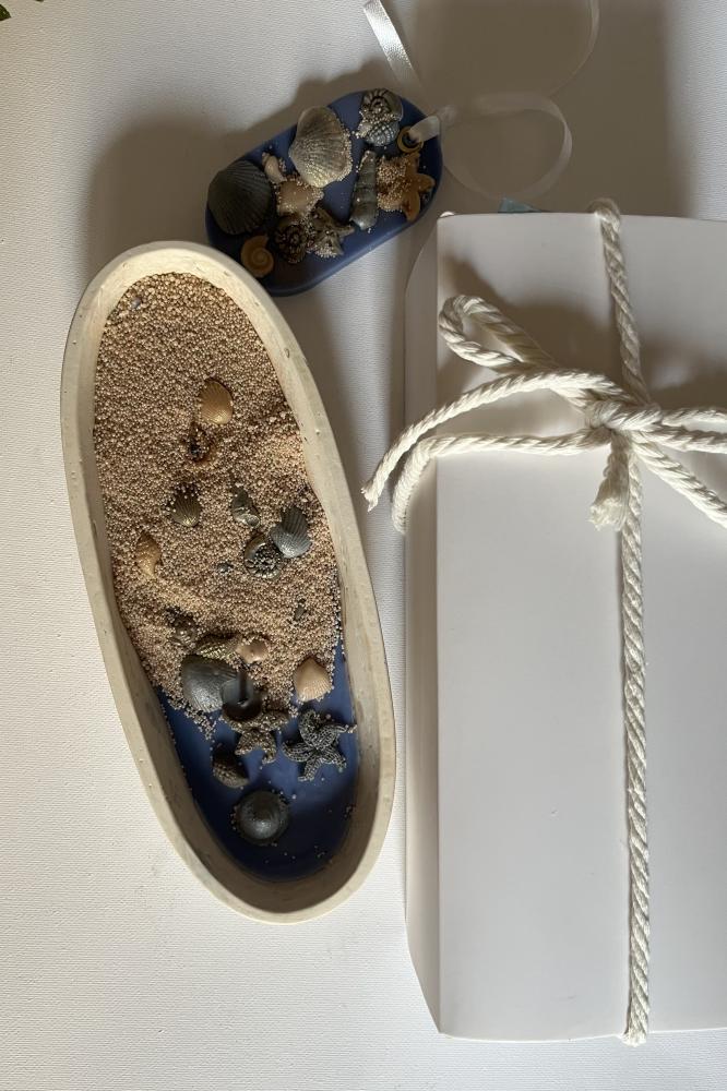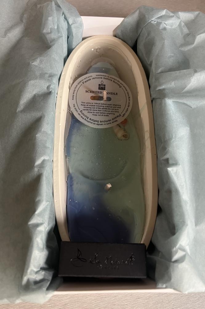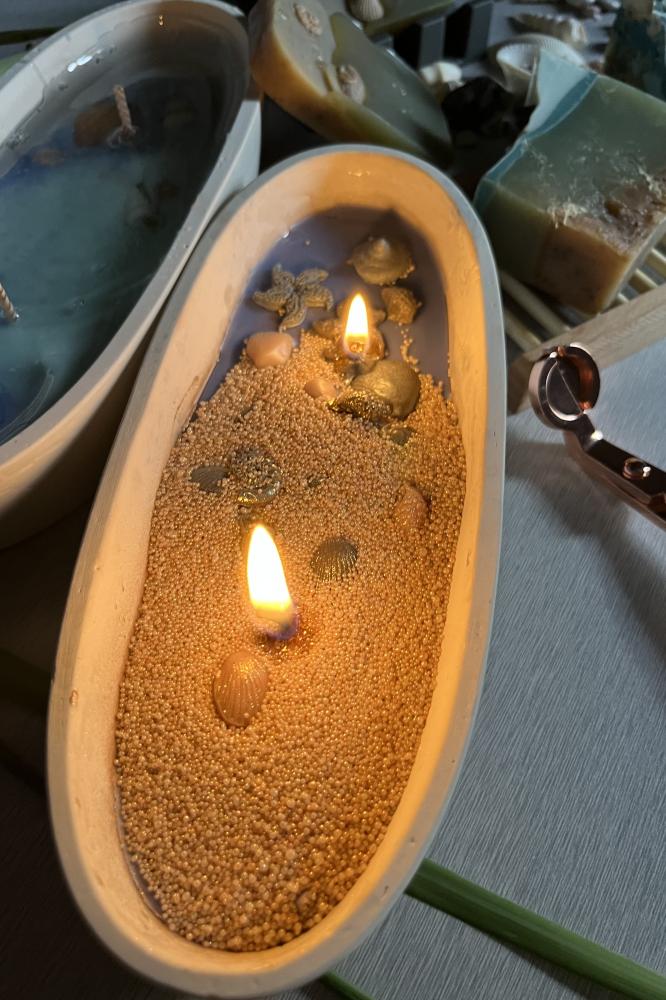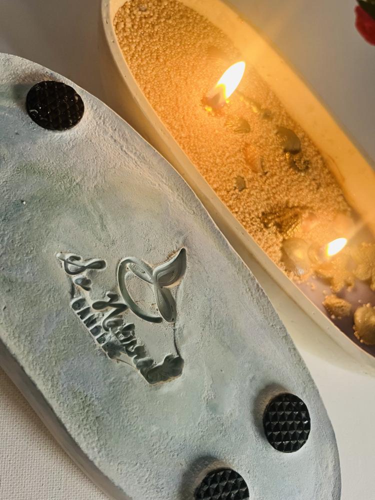 قالب من الكونكريت صنع خصيصاً لهذه الشمعة المميزة تنقلك إلى شاطئ هادي بروائح الجزر الجميلة ( جوز الهند والليمون غراس والشاي الأخضر ورائحة نسيم البحر)